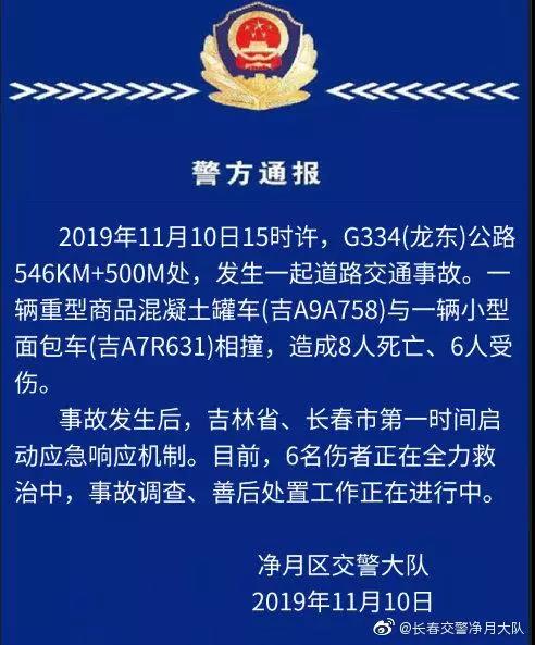 11月10日15時許,長春G334(龍東)公路發(fā)生一起道路交通事故。一輛重型商品混凝土罐車與一輛小型面包車相撞,造成8人死亡、6人受傷。